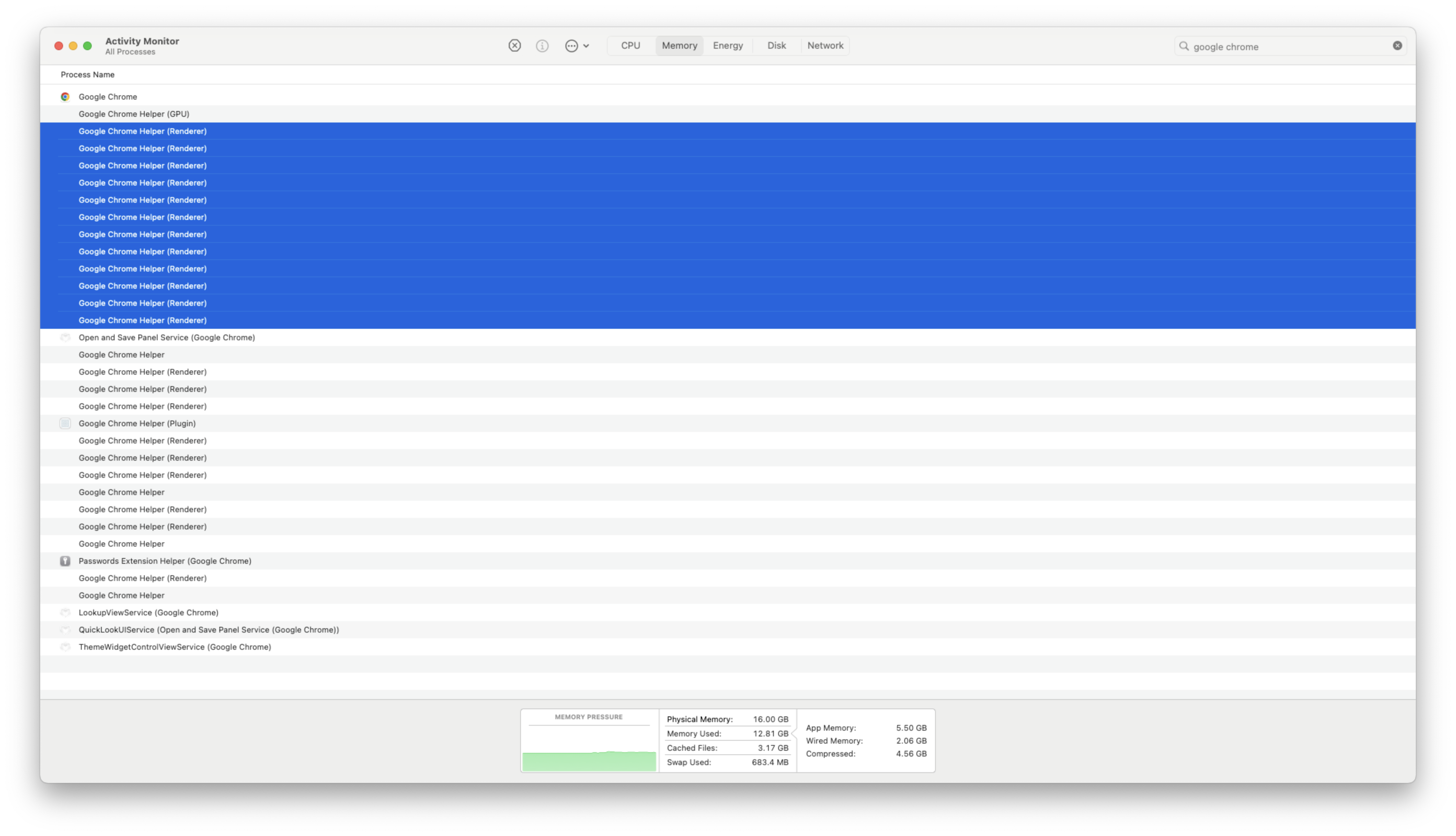 실제 Activity Monitor 에서 Google Chrome(Renderer) 프로세스가 켜놓은 탭마다 실행 중인 것을 볼 수 있다.
